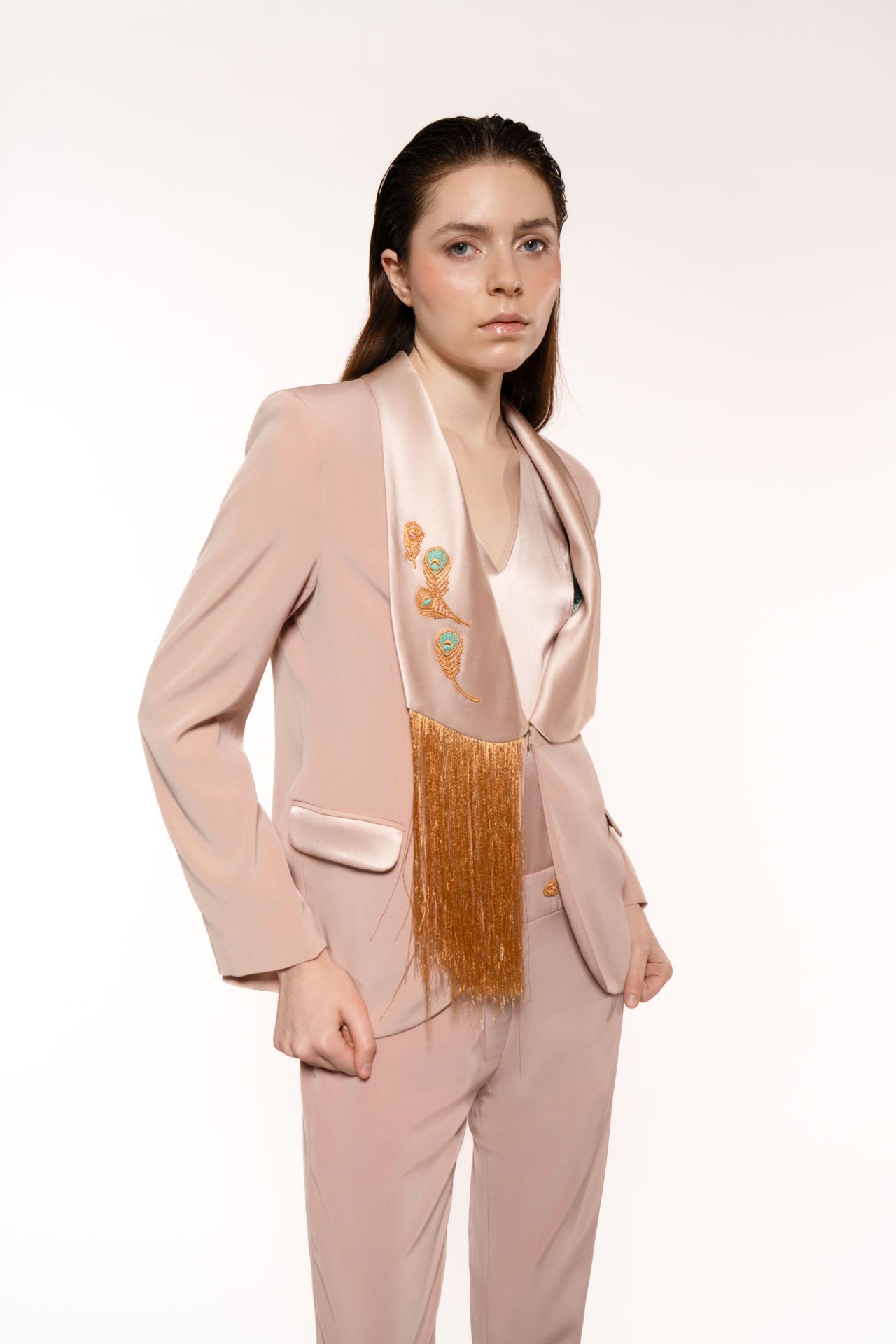 A jacket that is a true masterpiece of tailoring, crafted in cady fabric with a subtle play of matte and shiny textures on the body and collar. Adorned with silk fringes and hand-crafted peacock embroidery, created exclusively for the Sophia collection. Silk lining features delicate peacock print details. Versatile and softly fitted, perfect for any occasion.
