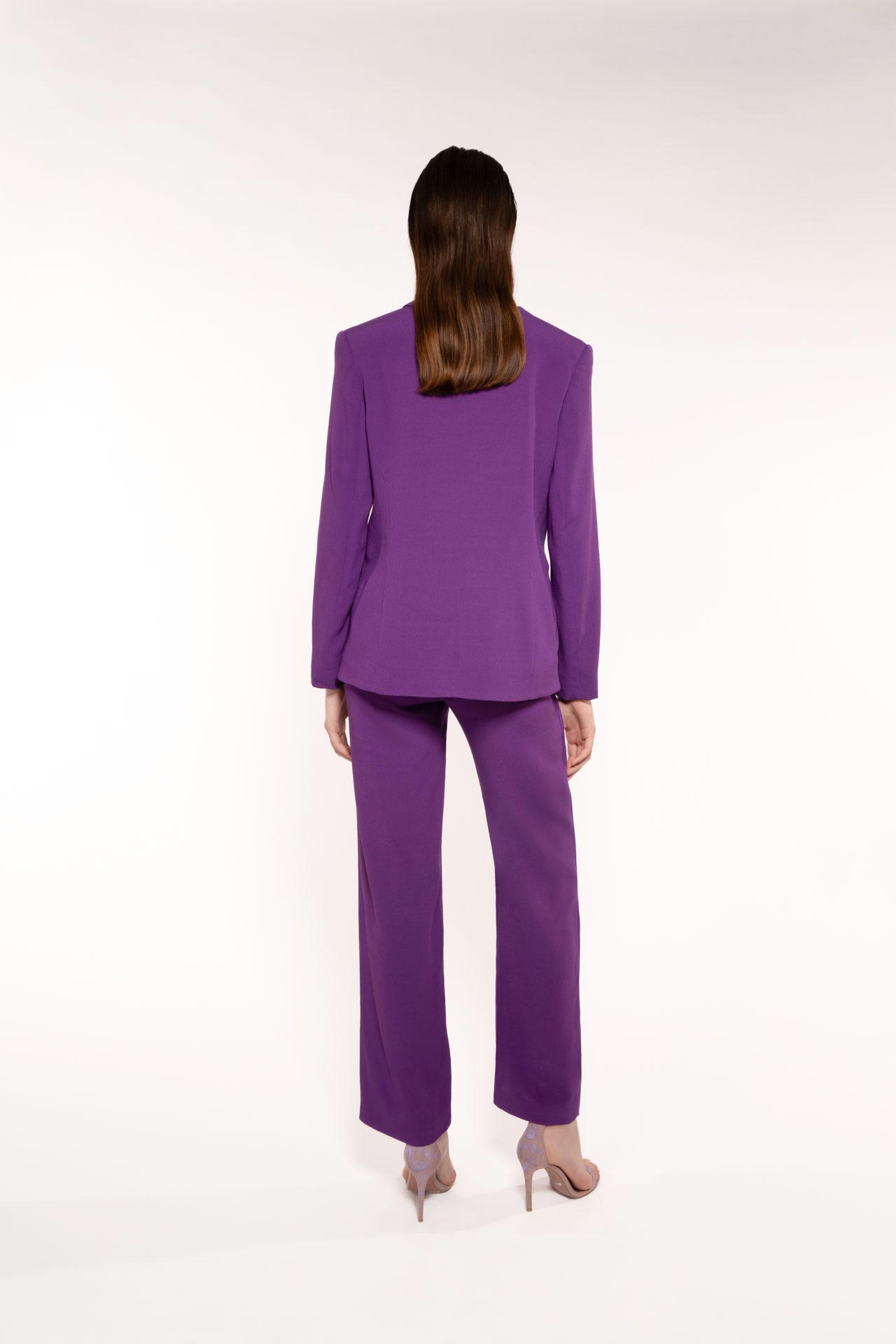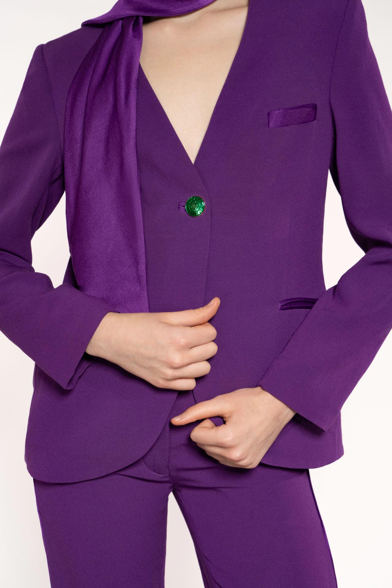 Cady jacket with a removable collar, featuring a subtle play of shiny and matte textures. Silk-lined with a delicate peacock print and finished with logo buttons. A versatile piece, perfect for any occasion.