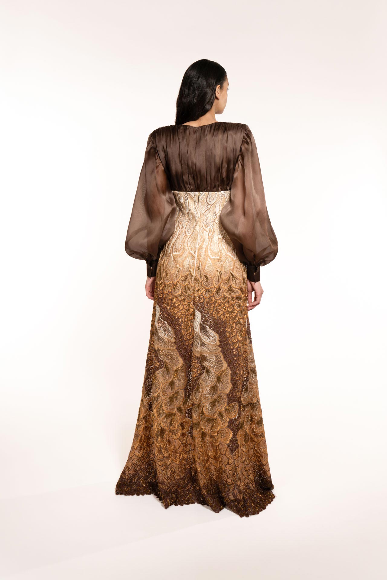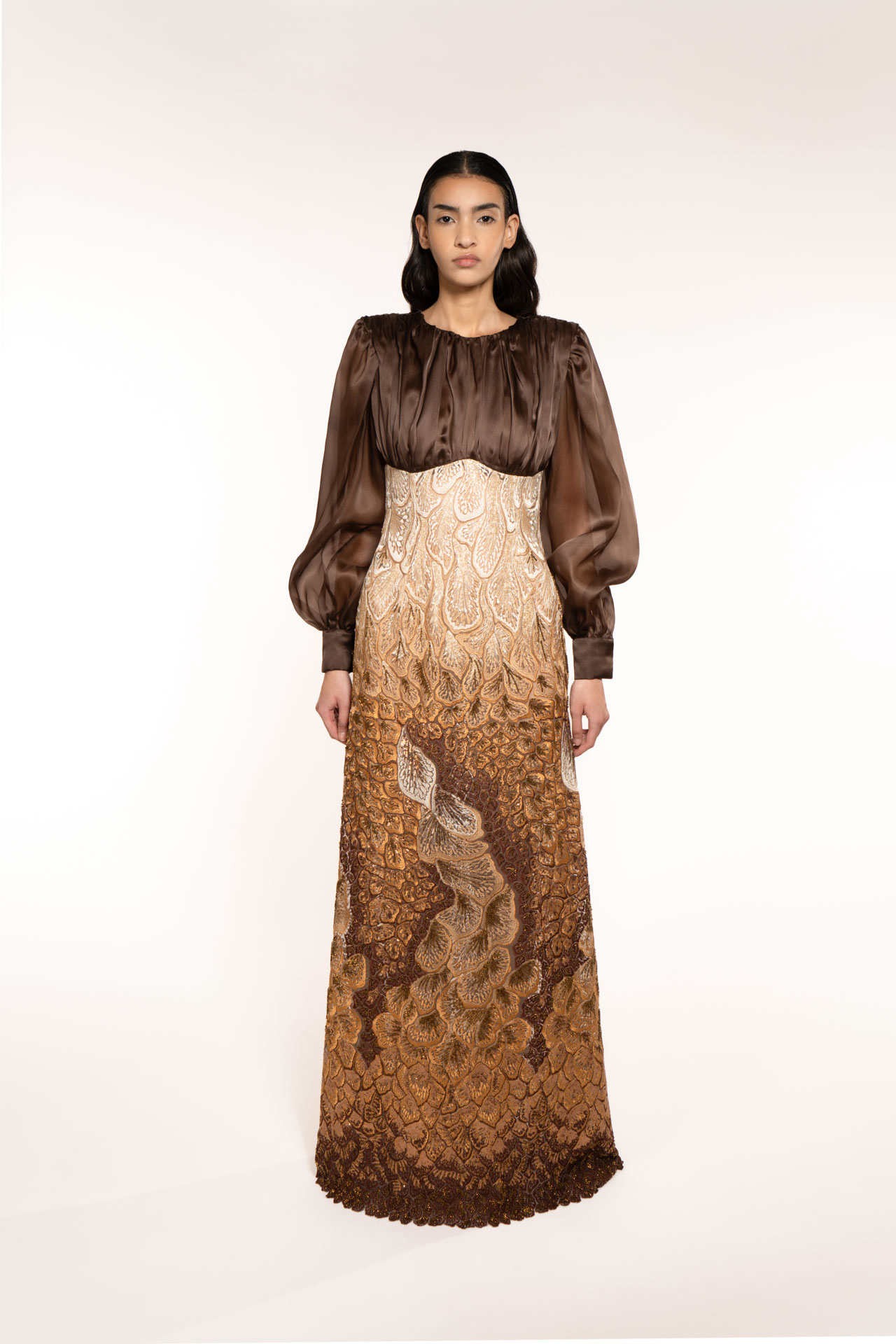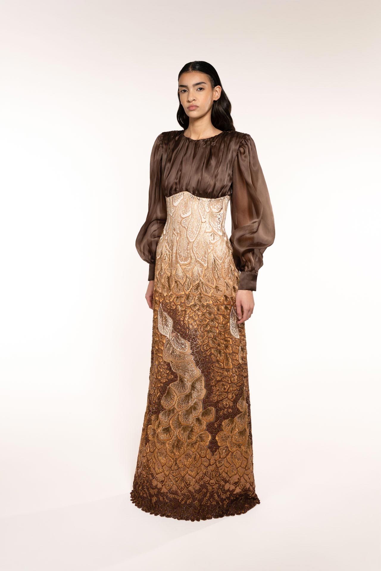 A long dress of timeless elegance, a fairytale dress. The draping at the shoulders, the long sleeves and the embroidery that starts from the high waist give this dress pride, elegance and femininity. close to the body, waisted, it delivers power with every step. It is the dress that best represents the strength of the earth element Maktub