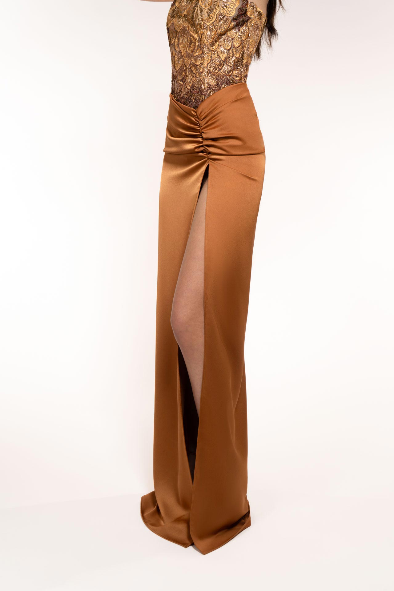 Skirt like a sarong, long with daily fabric. Versatile with a large slit and fabric knot that make it original and very feminine