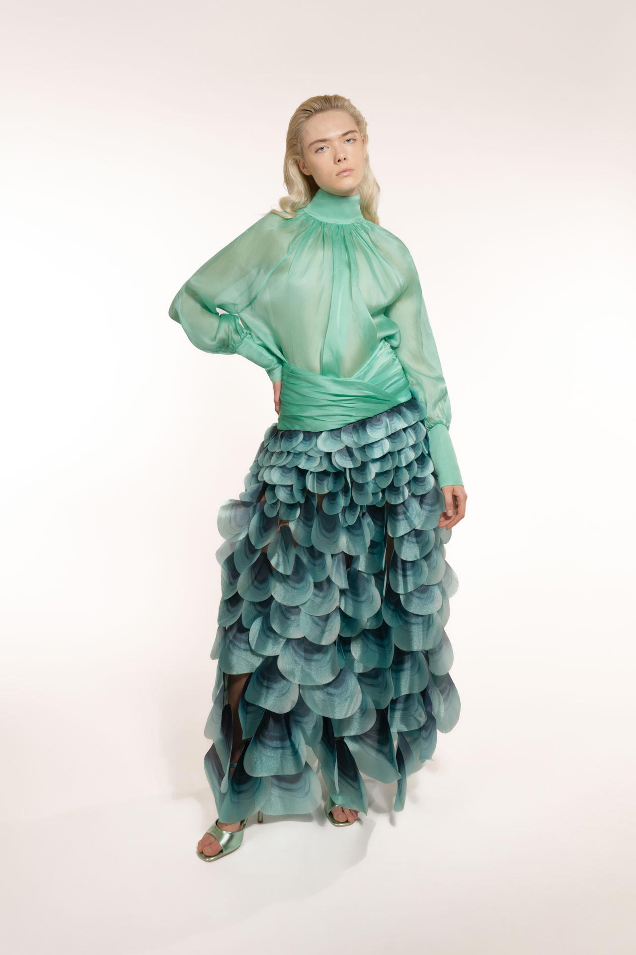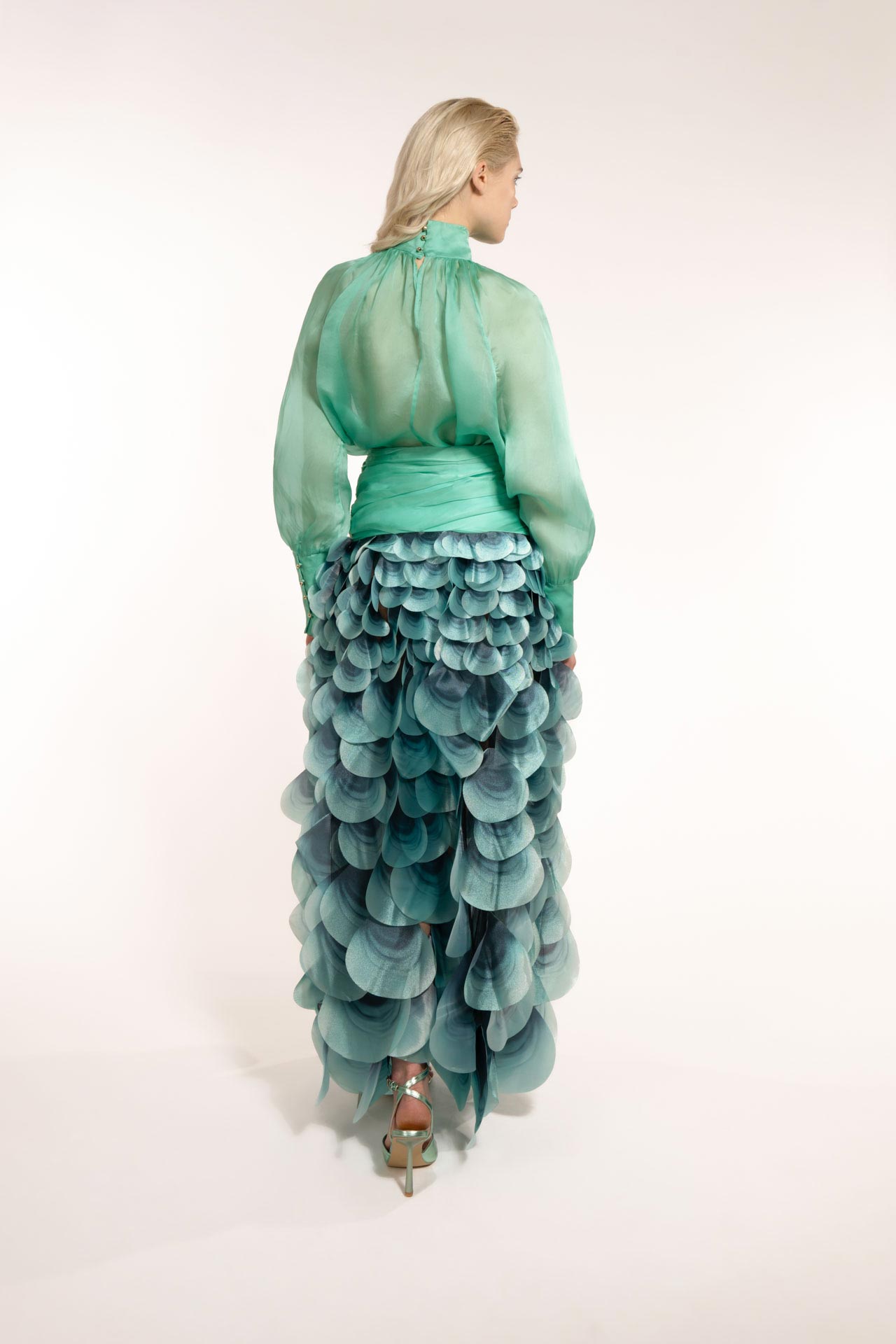 Loose shirt with high collar and long sleeves with high cuffs and jewel buttons. Perfect for day and evening. Wear over jeans or dress pants with heels or sneakers. a royal taste to your every look