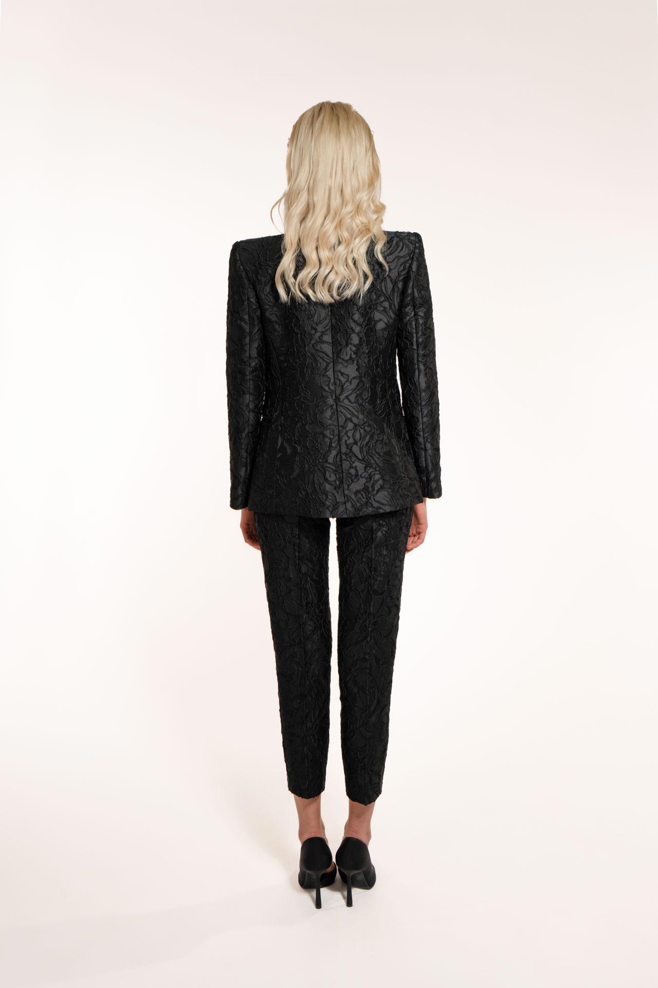 The black brocade trousers go perfectly with his blazer. It comes down tight to the ankle to make walking obstacle-free. It wraps around the legs giving the walk an aura of solemnity. The draped belt is the guardian of timeless elegance and timeless class