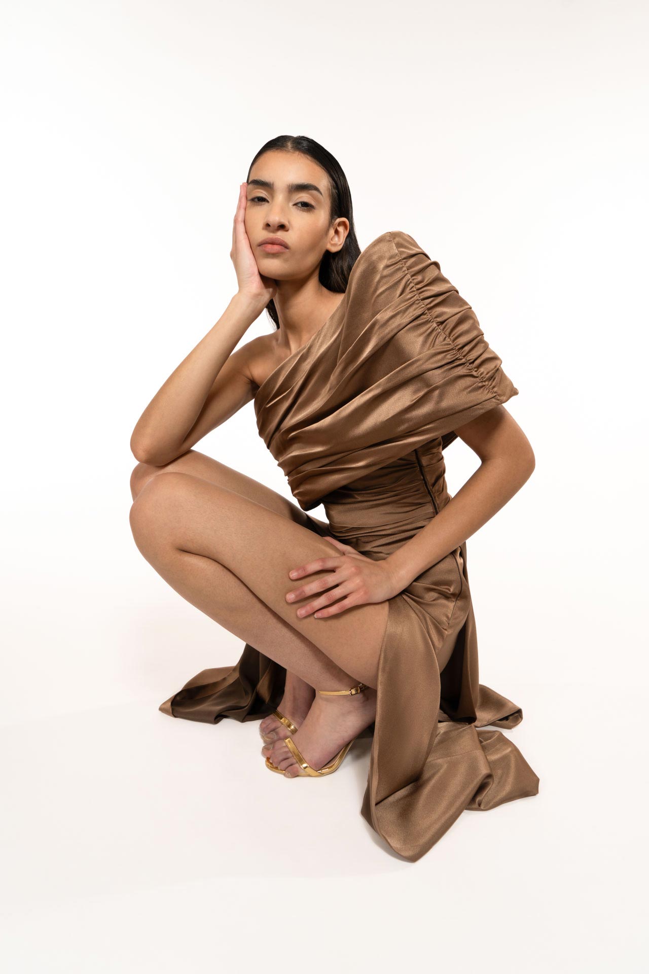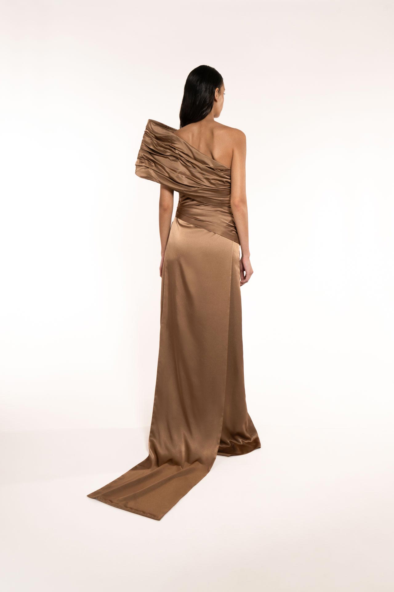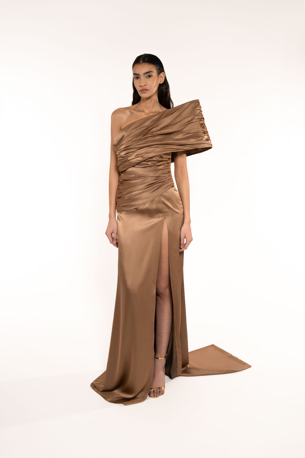 An evening DRESS that makes you dream. A structure with crinoline to emphasize one shoulder. The draping on the body highlights its silhouette. The very wide slit on the side highlights its femininity. Unlined dress, well structured bodice. Perfect for the red carpet