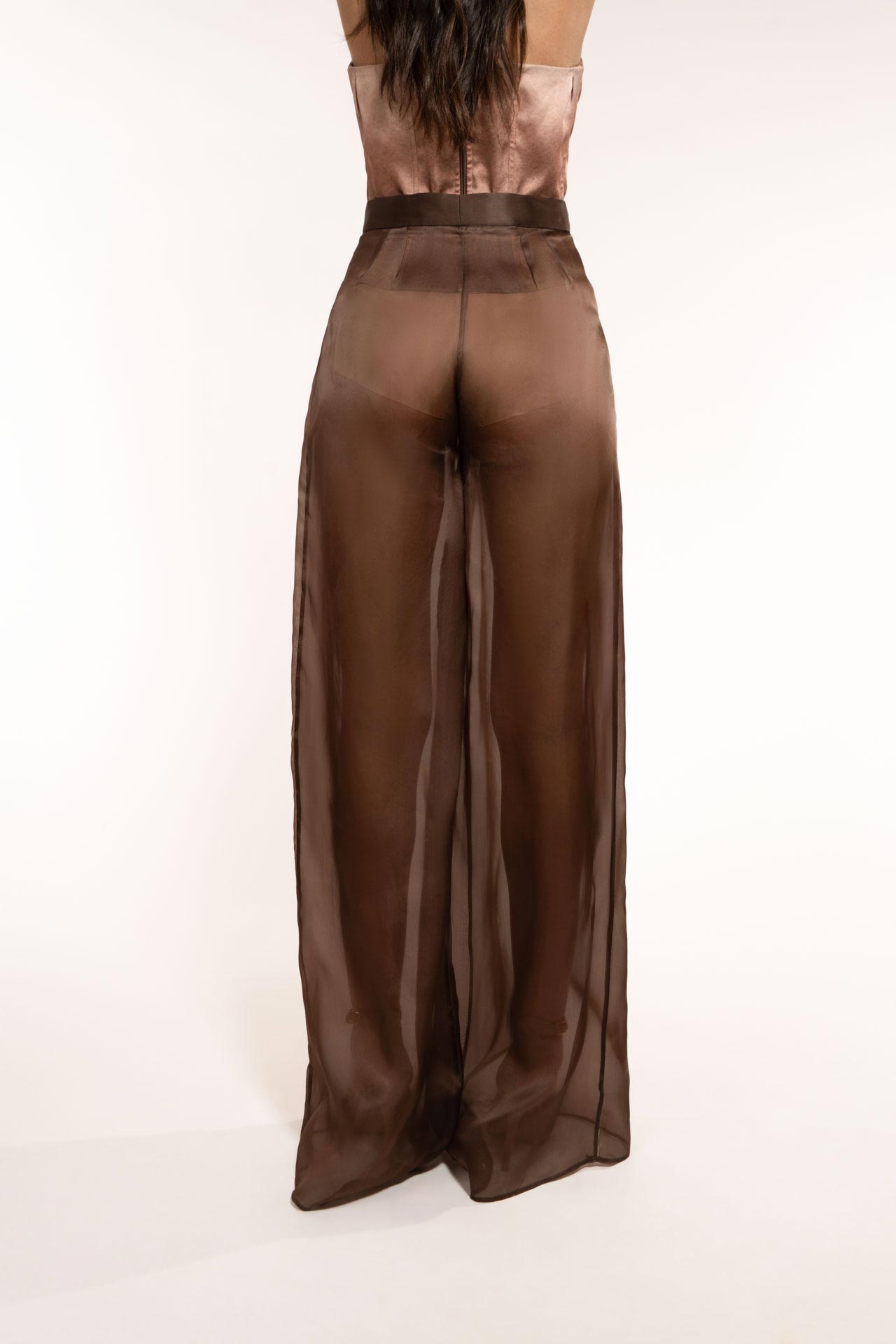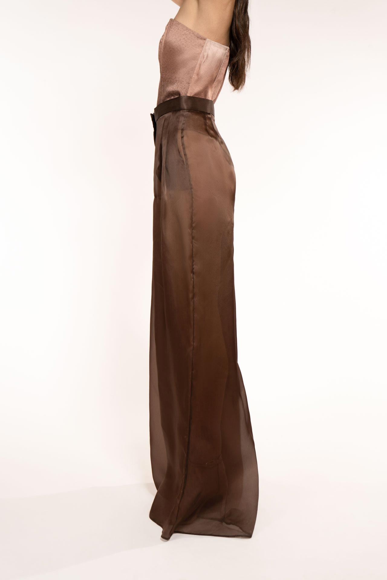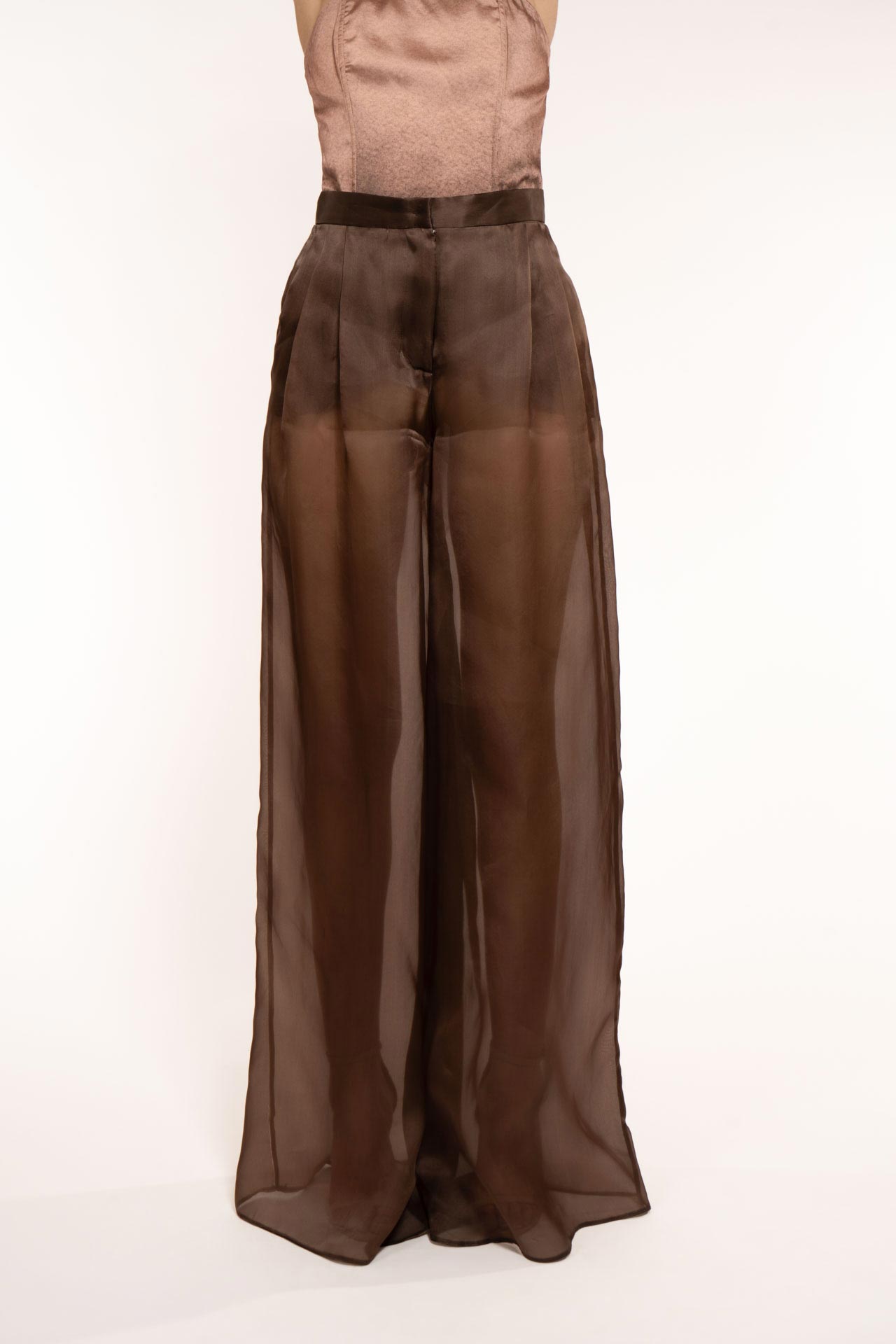 Wide trousers with men’s cut pleats in organza to reveal shapes and femininity. To be worn with hot pants. Versatile for day and evening. Its color perfectly recalls the earth element