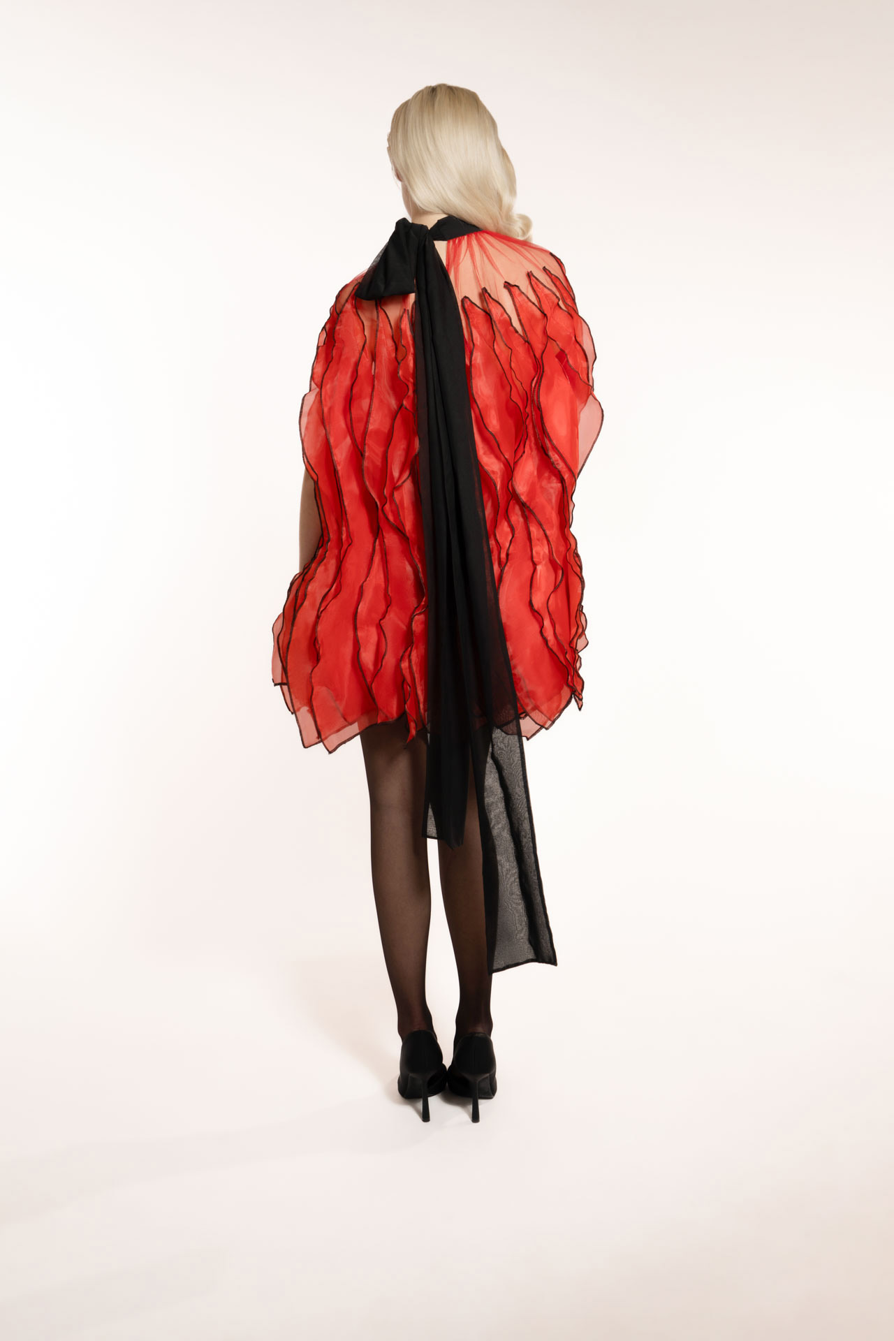 A dress, fire personified. Short, a flame that blazes. Closed at the back of the neck with a long black bow. With each movement the flame blazes up, grows and fills the atmosphere in a walk that gives power. The perfect dress for the fire element