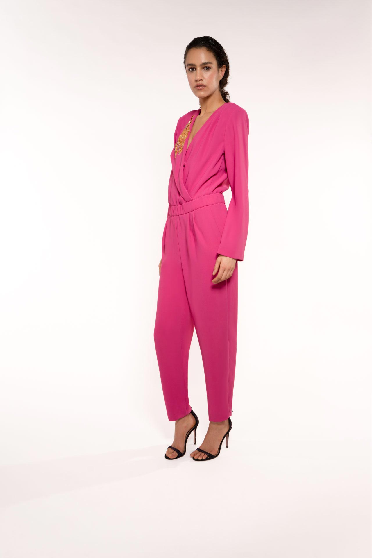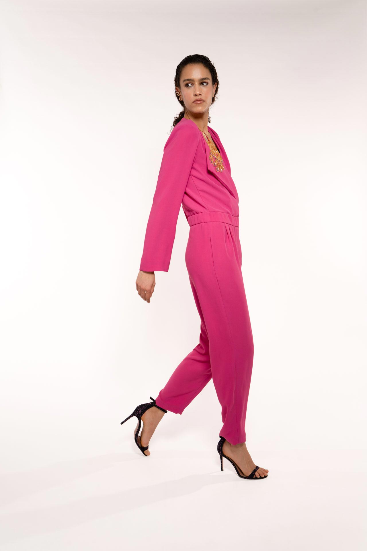 One of the first pieces designed for the Sophia collection, this jumpsuit exudes refinement and elegance. Versatile for any occasion, it can be styled with heels or sneakers, and layered with a denim or leather jacket. Handcrafted peacock embroidery adds a luxurious touch, while the wide front neckline ensures a chic, effortless look every time.