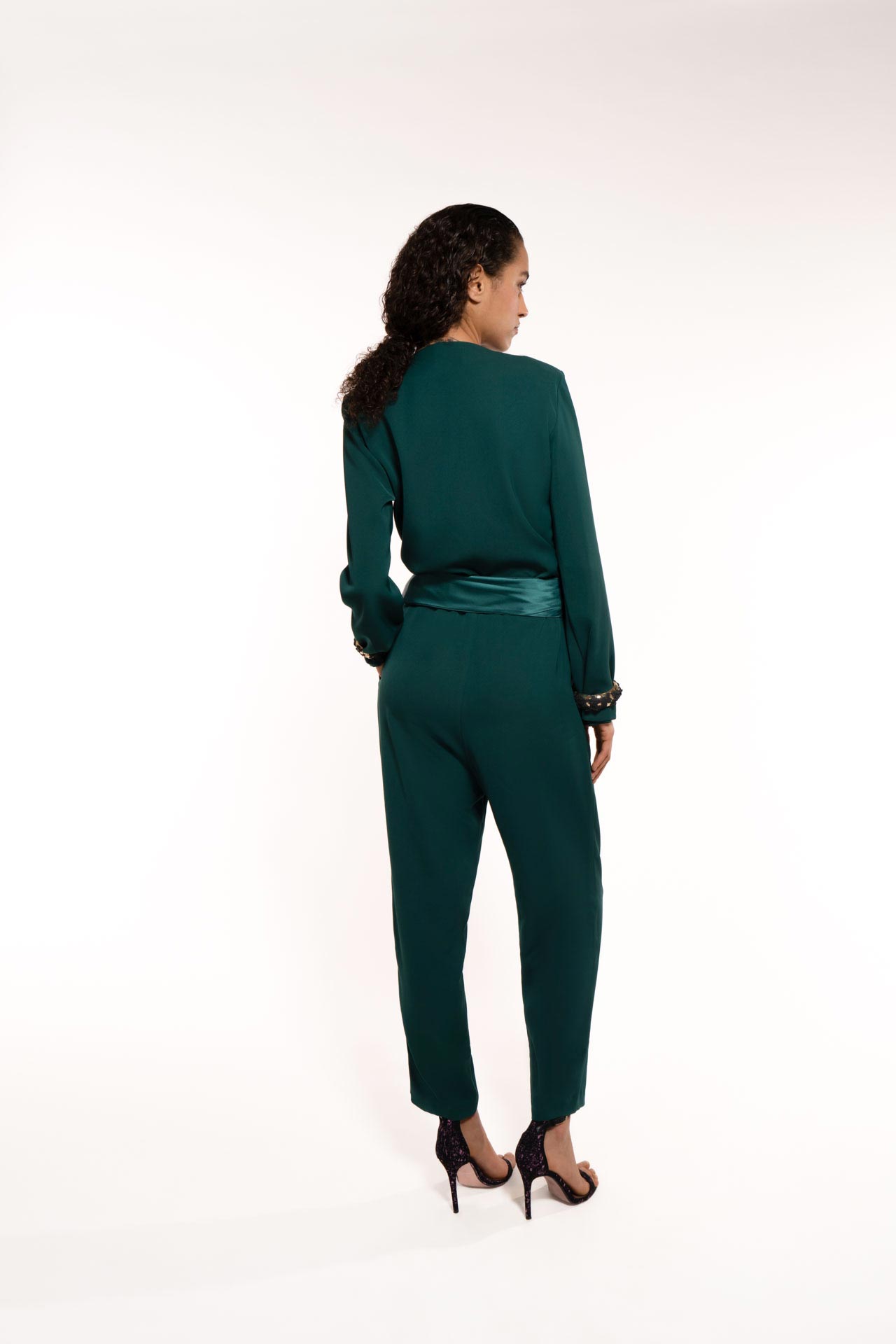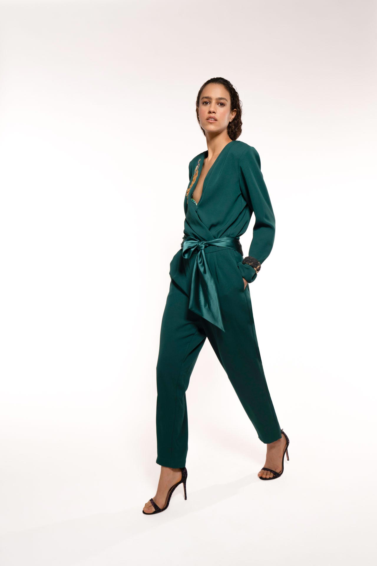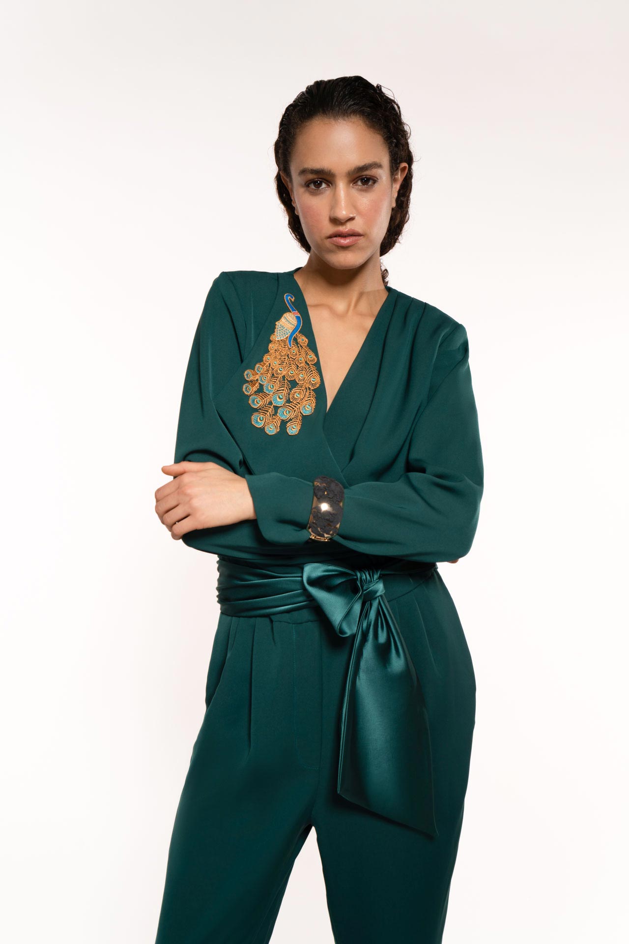 One of the first pieces designed for the Sophia collection, this jumpsuit exudes refinement and elegance. Versatile for any occasion, it can be styled with heels or sneakers, and layered with a denim or leather jacket. Handcrafted peacock embroidery adds a luxurious touch, while the wide front neckline ensures a chic, effortless look every time.