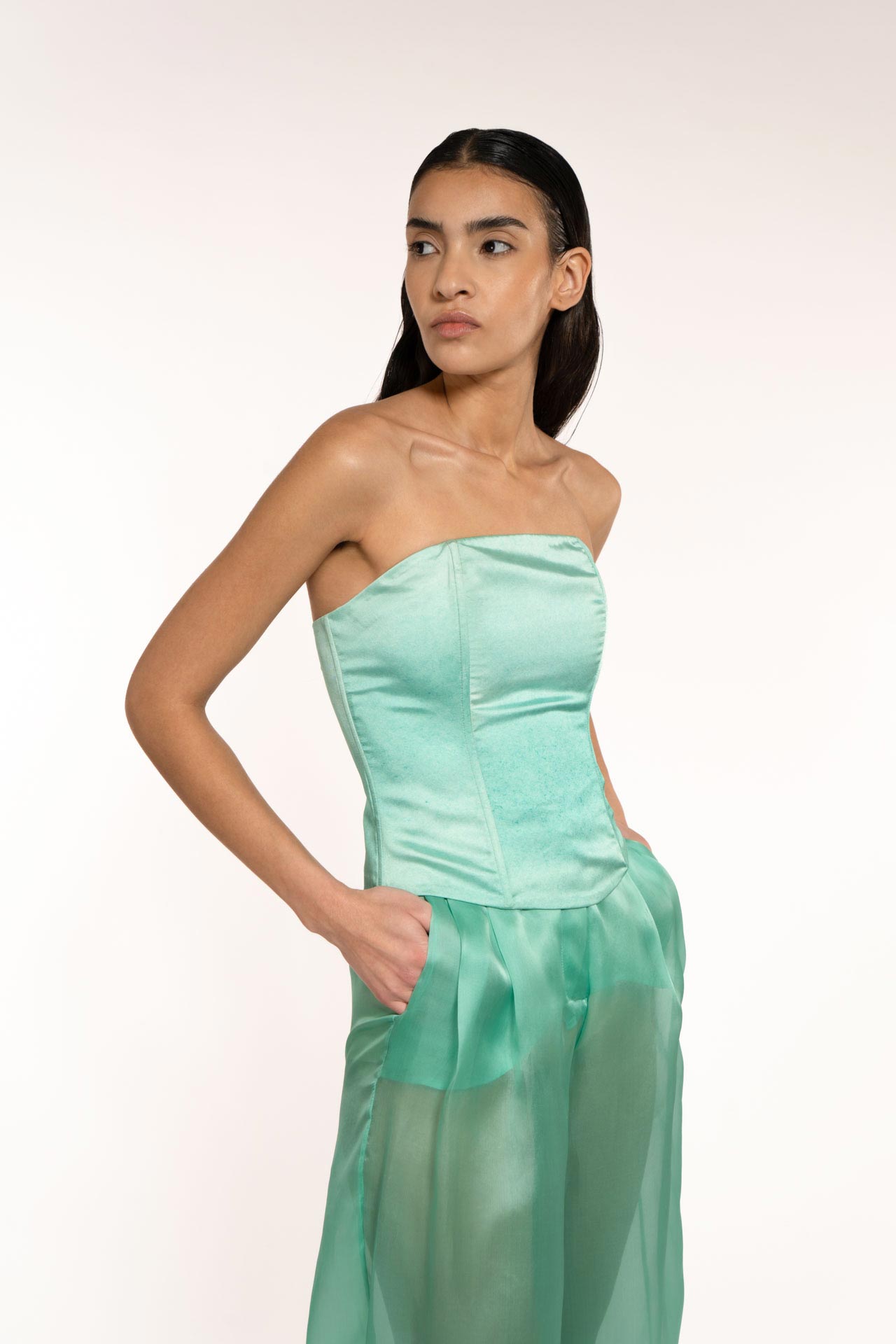 Corset made with structure and support stays. The print is unique to the Maktub collection, created with the water element in mind, with water colors applied to silk tweel. Versatile for any occasion
