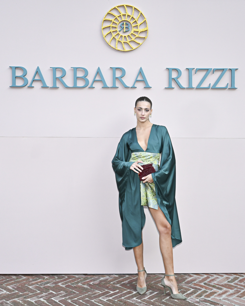 Carlotta Bertotti shines with peacock total look from SS24 collection at Barbara Rizzi event during fashion week