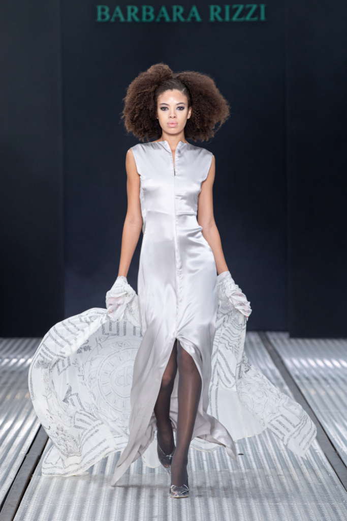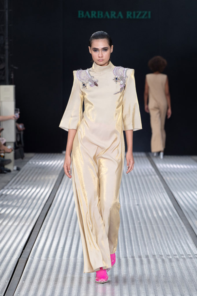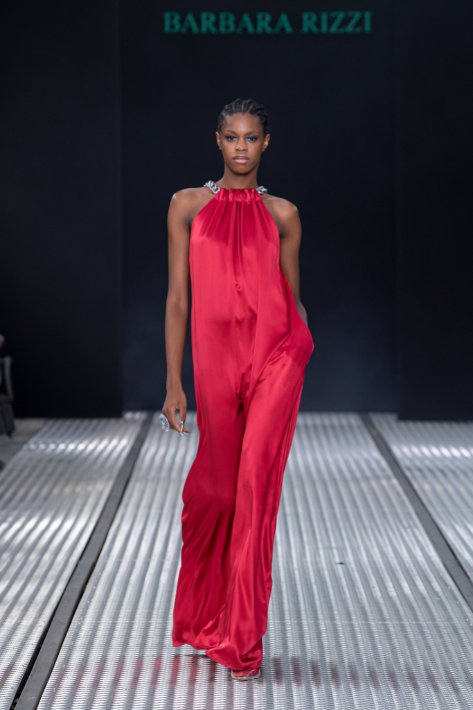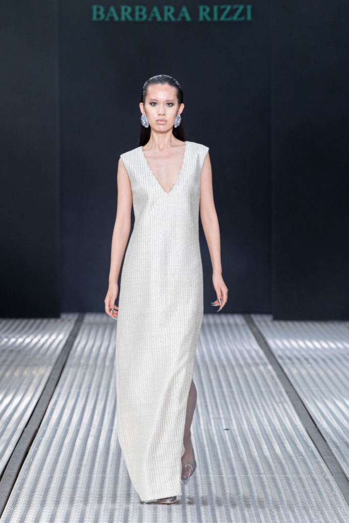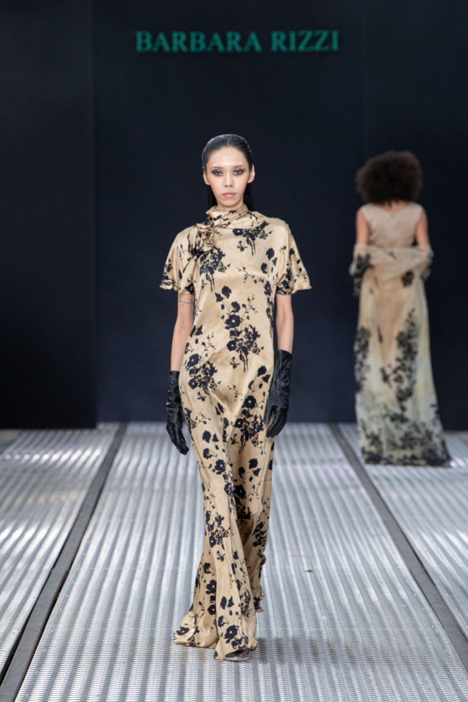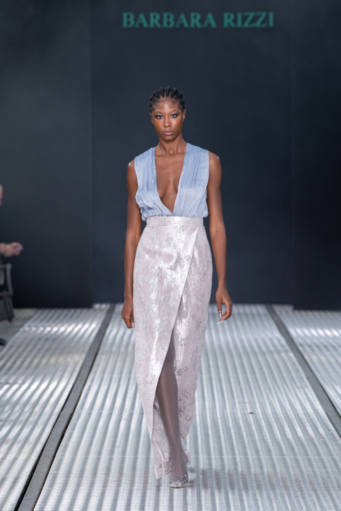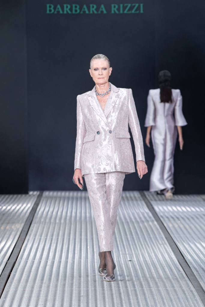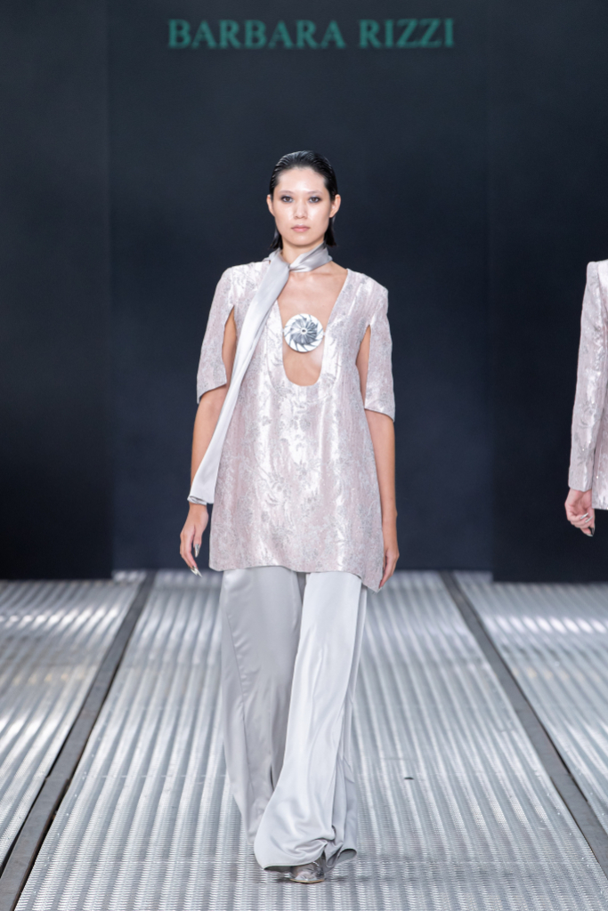 The collaboration with Vogue Italia further expanded the collection’s reach, as the event was live-streamed, enhancing Barbara Rizzi’s presence in the digital fashion space. The Rivair SS25 collection fused industrial design with high fashion luxury, featuring flowing dresses, tailored suits, and metallic accessories. Barbara Rizzi continues to reshape the future of fashion, offering a fresh perspective on strength, beauty, and modern luxury.