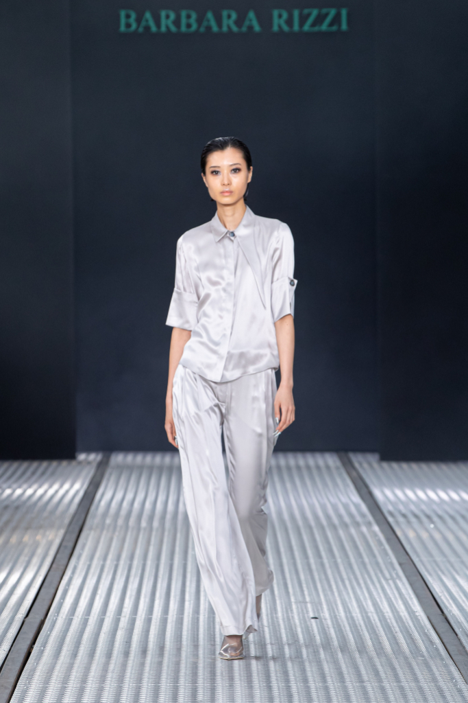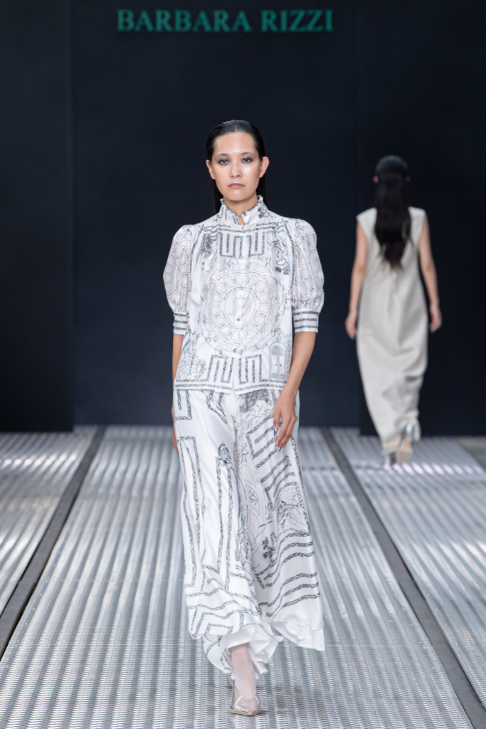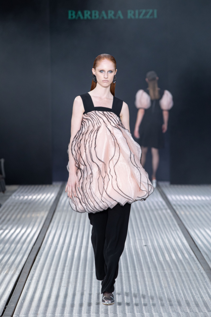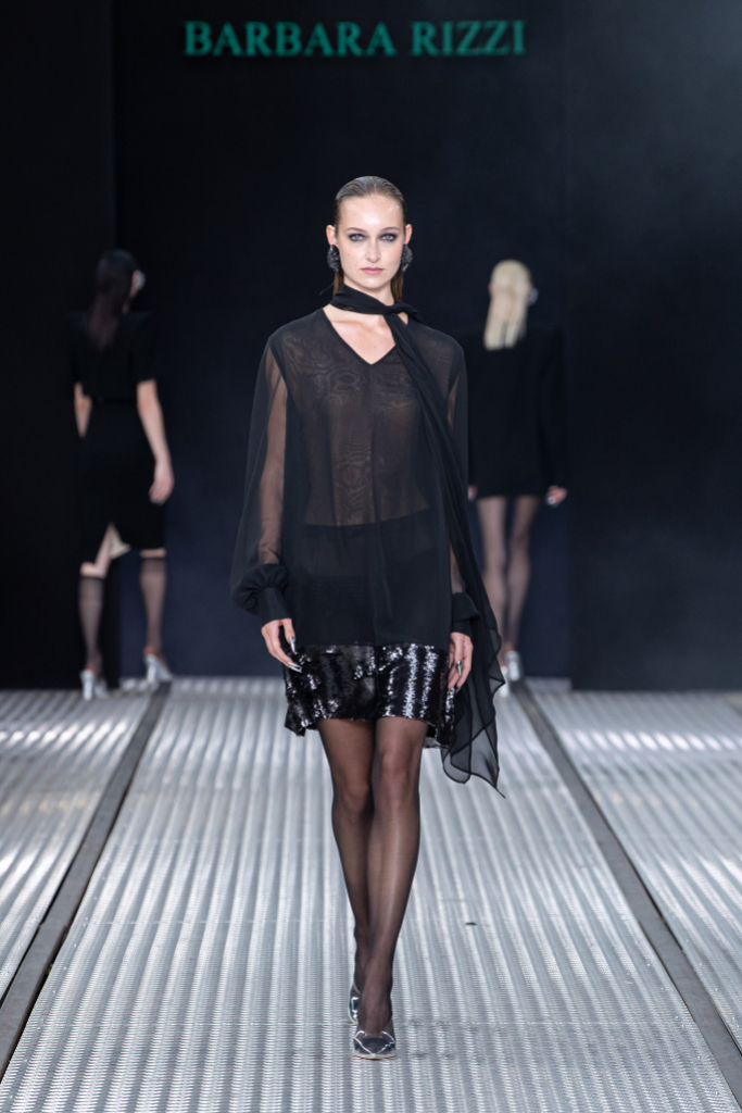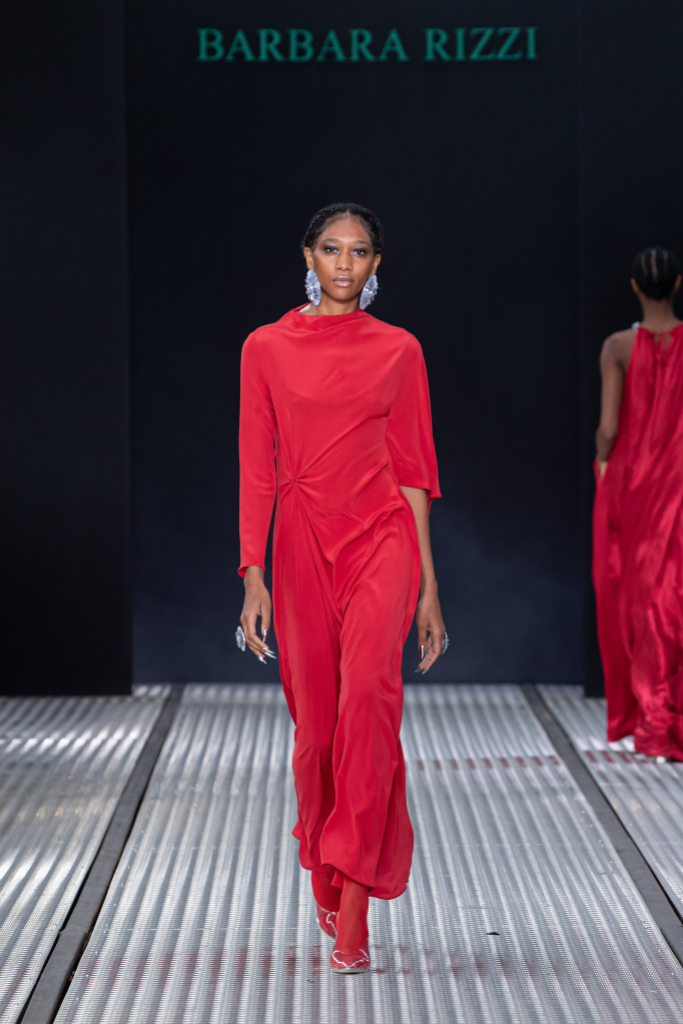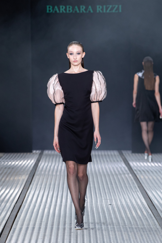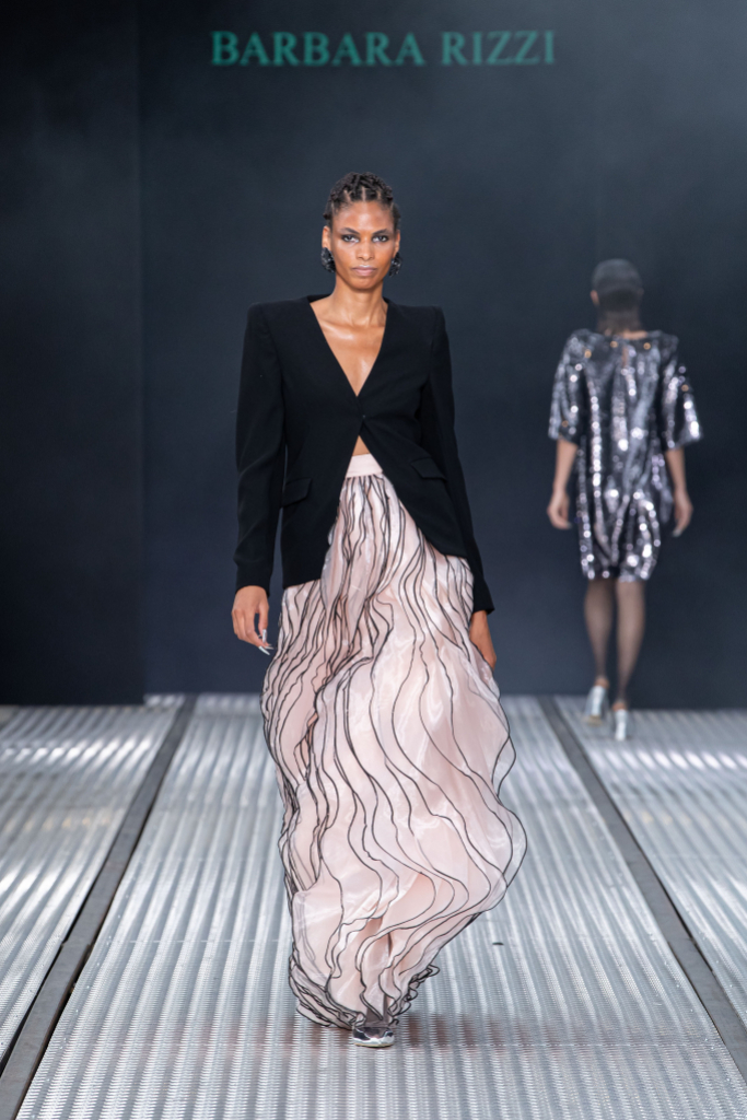 Barbara Rizzi’s Rivair SS25 collection was showcased at the National Museum of Science and Technology in Milan, set in a historic railway station. The venue’s industrial atmosphere perfectly complemented the collection’s theme of a contemporary woman—powerful, modern, and unapologetically elegant.