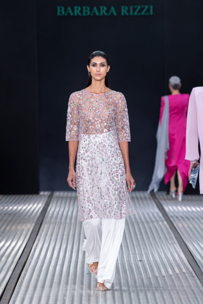 The blend of metallic finishes and structured silhouettes highlighted both femininity and strength, making the collection a bold statement on empowerment in fashion. The show attracted celebrity guests like Anna Dello Russo, Elisabetta Gregoraci, and Mahira Abdel Aziz, boosting the event’s visibility.