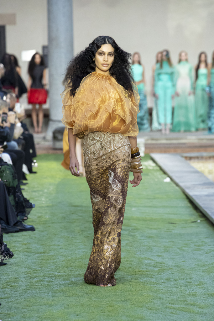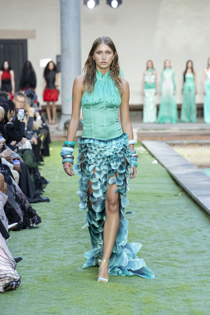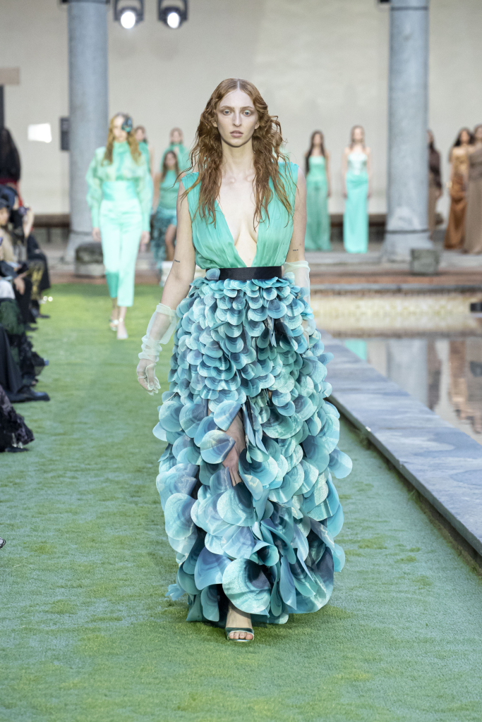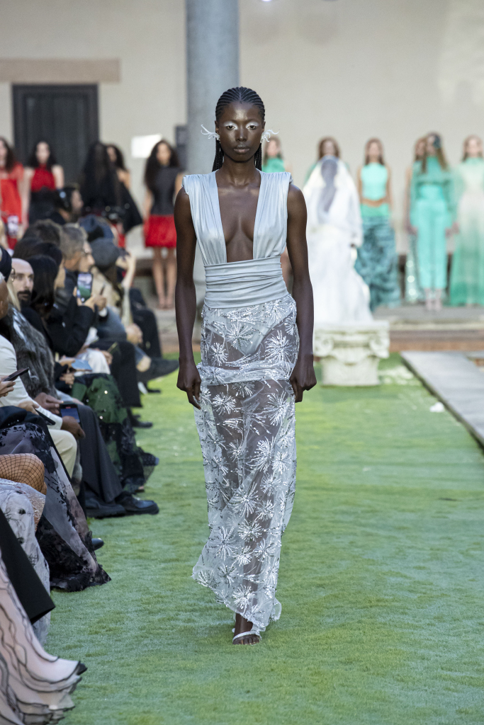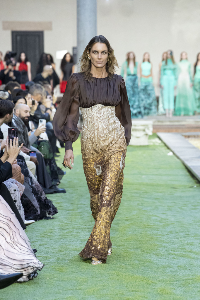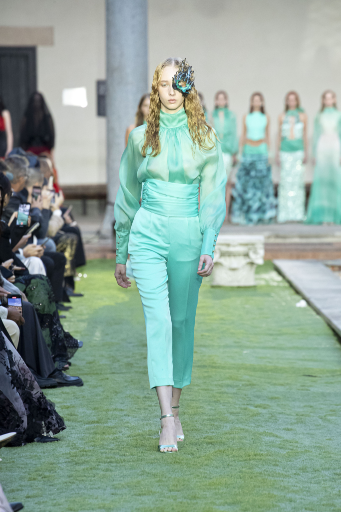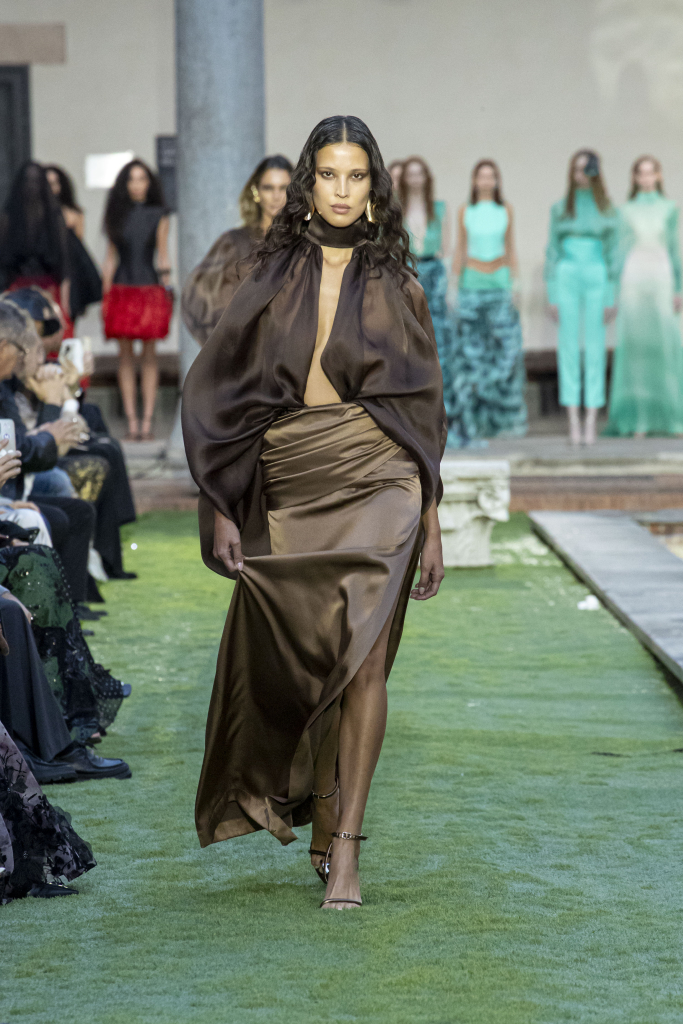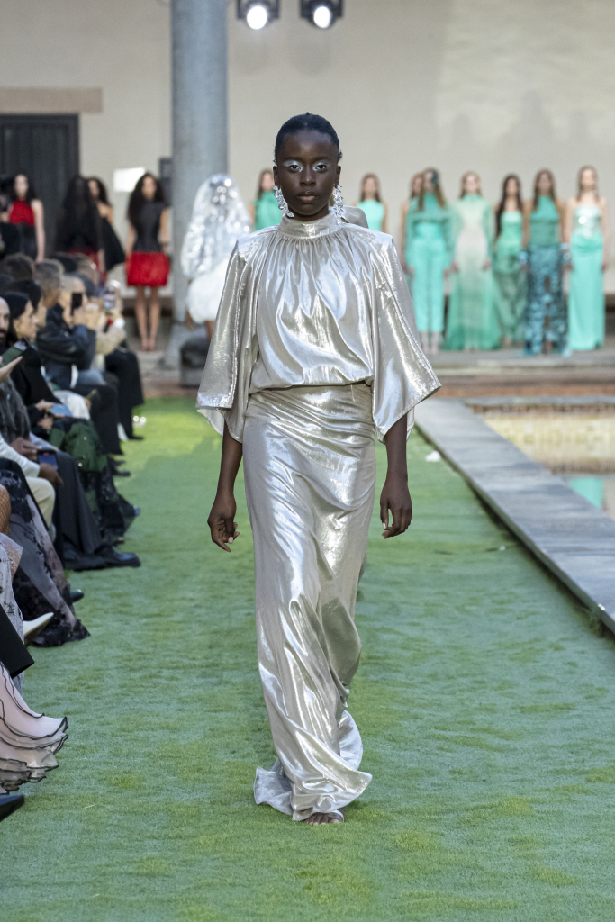 Barbara Rizzi’s new collection is a mystical journey inspired by the Arabic word Maktub “everything is written”; a concept drawn from Paulo Coelho’s The Alchemist. The runway becomes a tale of destiny, magic, and the four elements: Earth, Air, Water, and Fire, reinterpreted through fluid silhouettes and light armors that exalt powerful femininity. Each color is a spell: white and silver like moonlight, gold as sacred power, sea green as intuition, red as passion, black as protection. Luxurious fabrics such as brocade, silk, chiffon, and organza evoke esoteric nobility and ethereal mystery, while crêpe and cady define refined draping. The fifth element, Freedom, surges as the ultimate expression of this collection, bold and magnetic like the women it celebrates. Timeless elegance blends with arcane allure: the witches are back, not as dark figures, but as luminous, self-confident icons of beauty and strength.