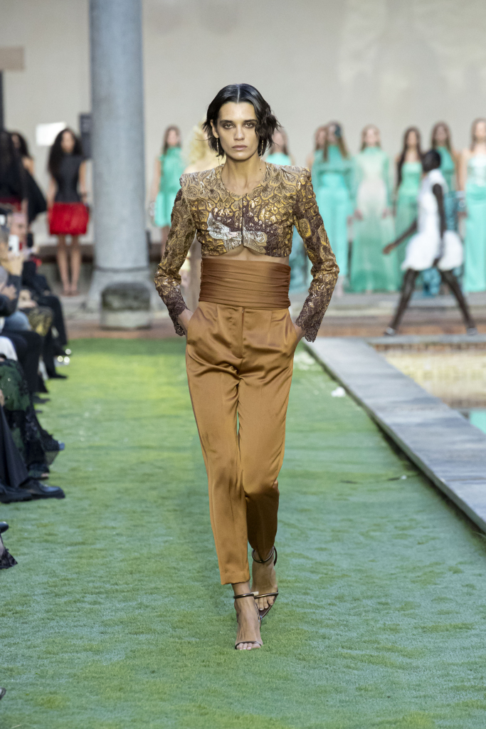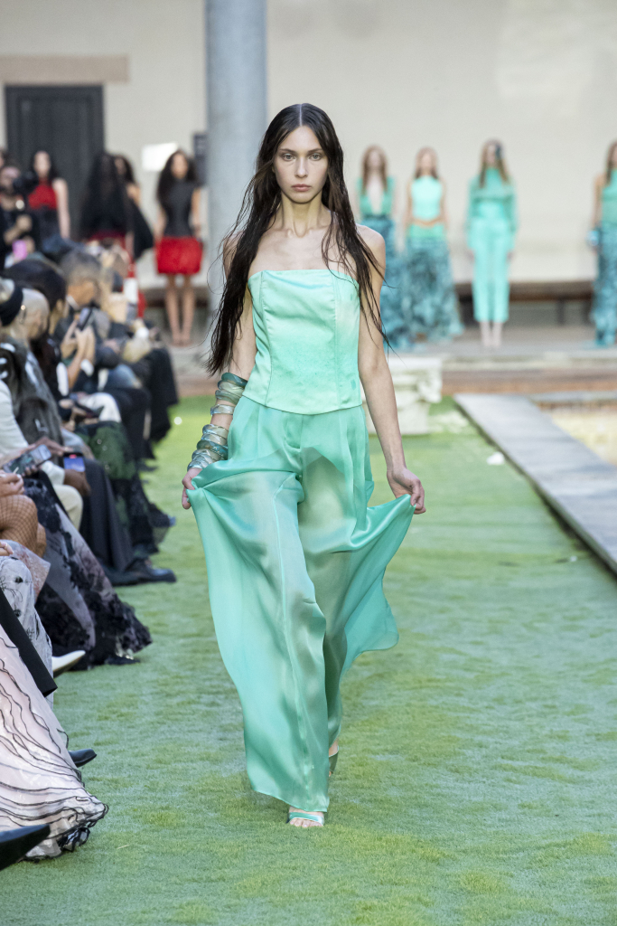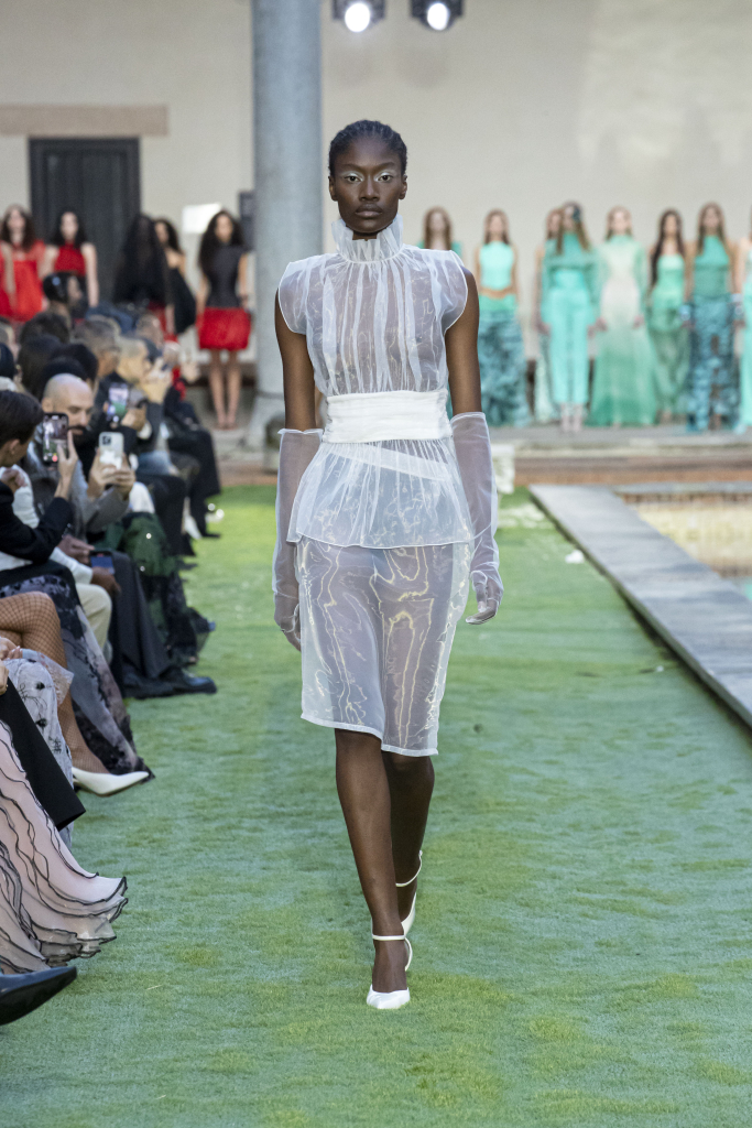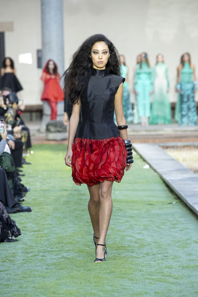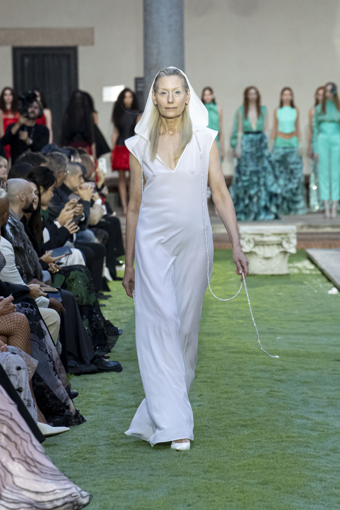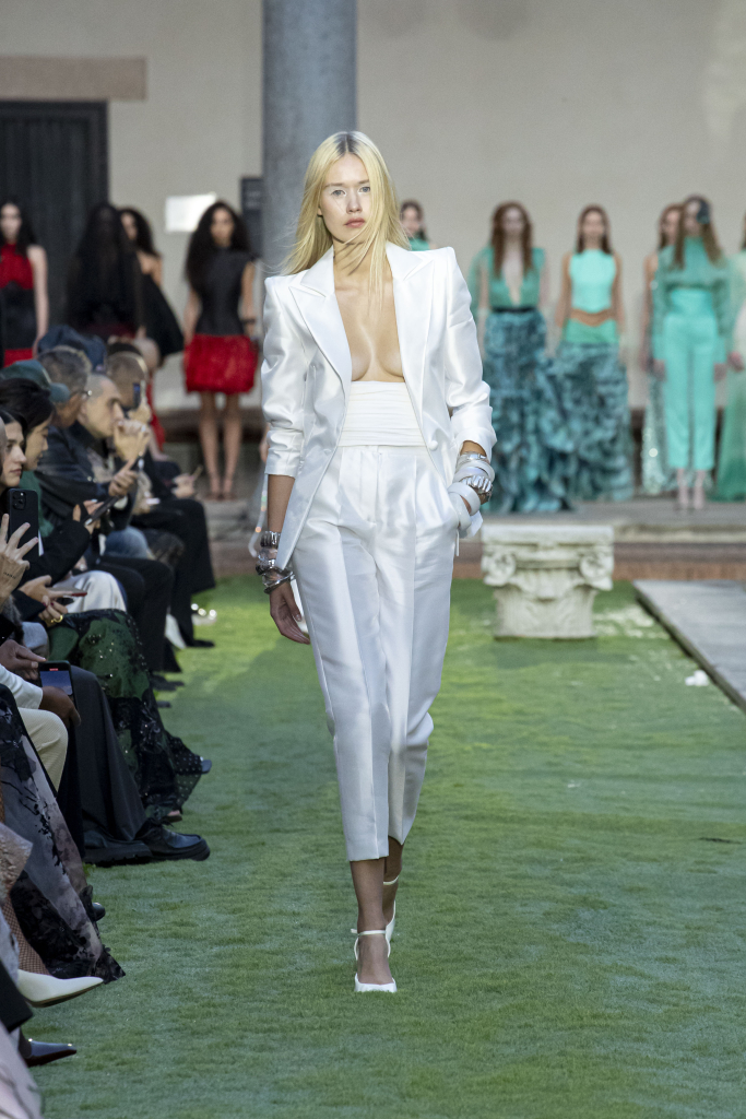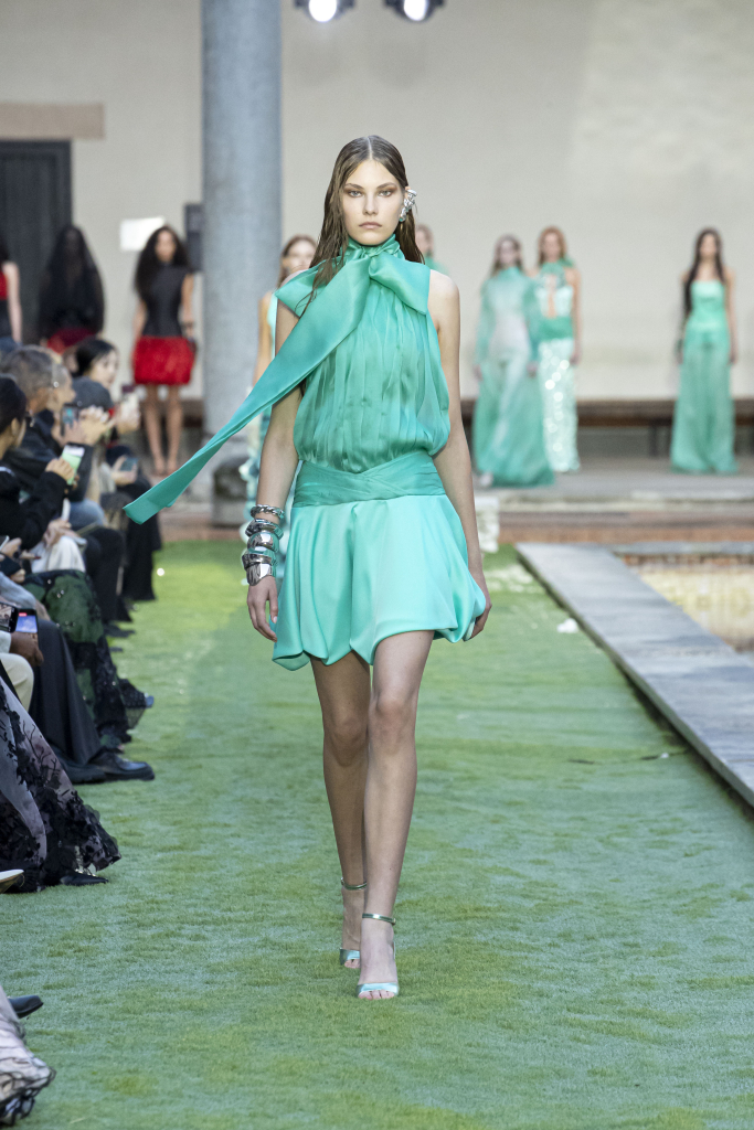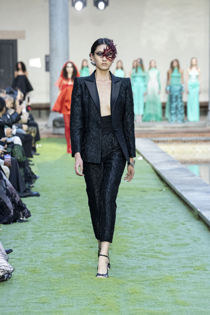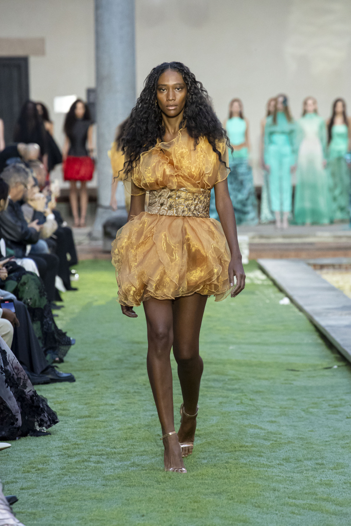 Barbara Rizzi’s new collection is a mystical journey inspired by the Arabic word Maktub “everything is written”; a concept drawn from Paulo Coelho’s The Alchemist. The runway becomes a tale of destiny, magic, and the four elements: Earth, Air, Water, and Fire, reinterpreted through fluid silhouettes and light armors that exalt powerful femininity. Each color is a spell: white and silver like moonlight, gold as sacred power, sea green as intuition, red as passion, black as protection. Luxurious fabrics such as brocade, silk, chiffon, and organza evoke esoteric nobility and ethereal mystery, while crêpe and cady define refined draping. The fifth element, Freedom, surges as the ultimate expression of this collection, bold and magnetic like the women it celebrates. Timeless elegance blends with arcane allure: the witches are back, not as dark figures, but as luminous, self-confident icons of beauty and strength.