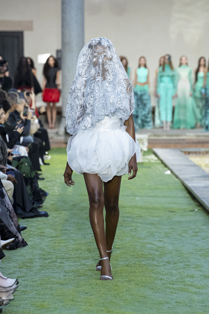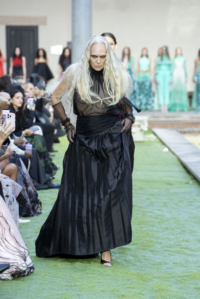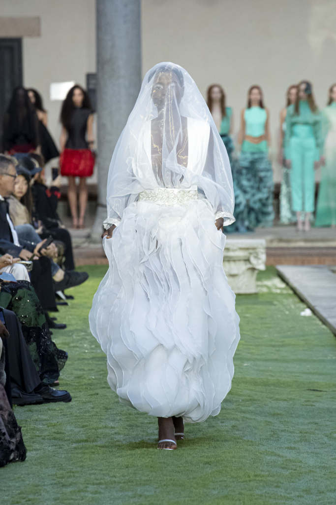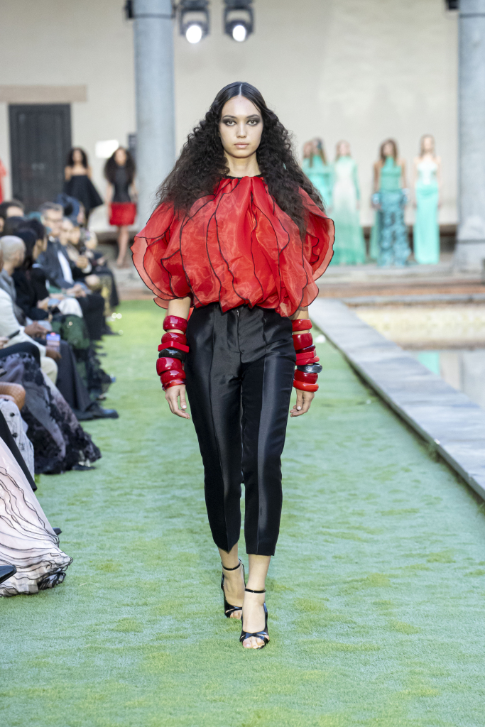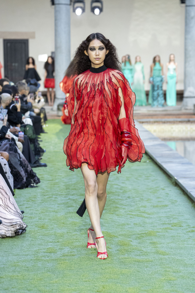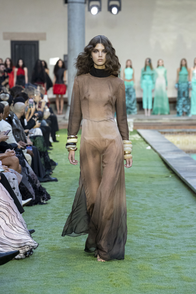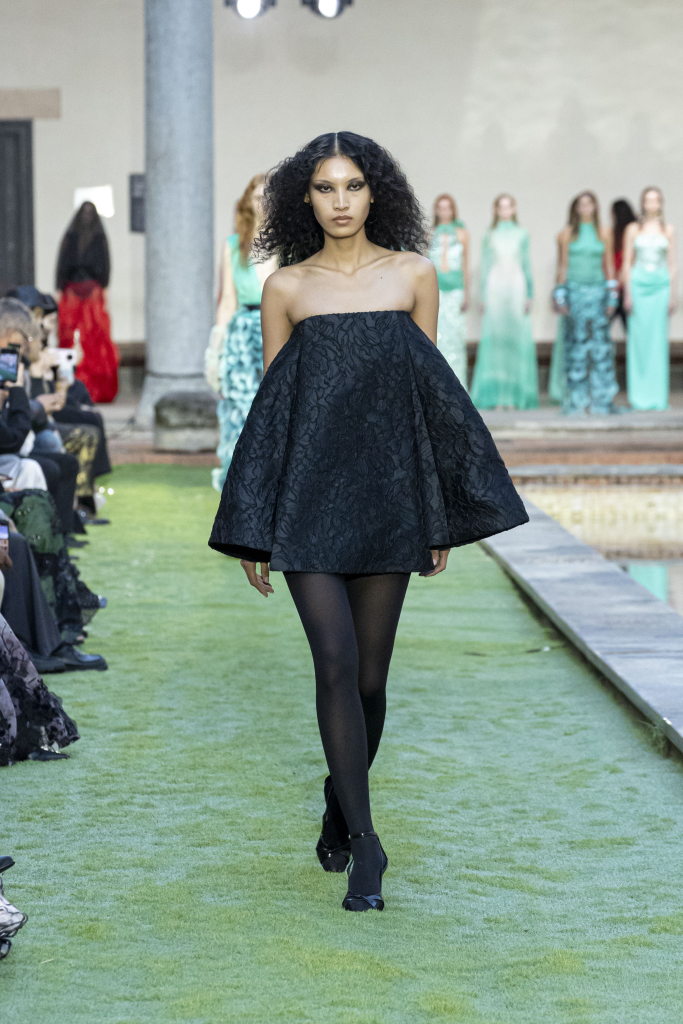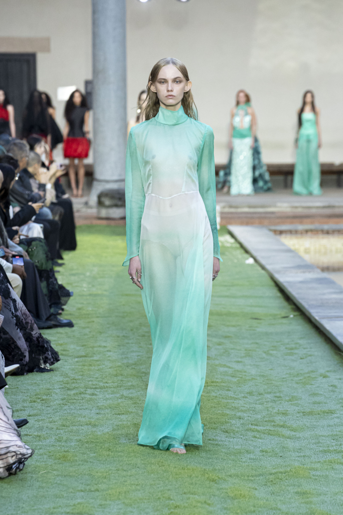 Barbara Rizzi’s new collection is a mystical journey inspired by the Arabic word Maktub “everything is written”; a concept drawn from Paulo Coelho’s The Alchemist. The runway becomes a tale of destiny, magic, and the four elements: Earth, Air, Water, and Fire, reinterpreted through fluid silhouettes and light armors that exalt powerful femininity. Each color is a spell: white and silver like moonlight, gold as sacred power, sea green as intuition, red as passion, black as protection. Luxurious fabrics such as brocade, silk, chiffon, and organza evoke esoteric nobility and ethereal mystery, while crêpe and cady define refined draping. The fifth element, Freedom, surges as the ultimate expression of this collection, bold and magnetic like the women it celebrates. Timeless elegance blends with arcane allure: the witches are back, not as dark figures, but as luminous, self-confident icons of beauty and strength.